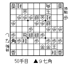飛車落ちの定跡&個人実戦集。著者はTV番組「クイズダービー」などでおなじみの大橋巨泉。飛落ちでもっともメジャーな定跡は右四間である。かなり完成度の高い定跡であるが、細かい変化が多くマスターするのは大変。また、攻め始めたら一気に攻め切る必要があり、少しでも間違えると反撃されてしまうという、線の細さがある。 そこで、「もっと下手が勝ちやすく、力を出せる指し方はないか」と多くの人が試みた。文人でいえば、山口瞳やつのだじろうなど。この“巨泉流”もその中の一つである。 右図が巨泉流の理想形で、ポイントは以下のようになる。 (1)序盤は右四間に構える。 (2)▲4八飛に△3三桂以外ならただちに▲4五歩と仕掛ける。 (3)△3三桂なら、▲6六歩〜▲6五歩と位を取り、さらに▲7八銀〜▲6七銀上と位を補強する。 (4)△1四歩には▲3八金と上がる。また△1三角には▲4七金と上がる。 (5)▲7八飛と振り直し、石田流に構える。 (6)囲いは▲2八玉-▲3八金-▲4八金型が基本。 (7)玉頭の位は取らせる。 (8)△5三銀-△3一角型を見てから▲9七角と上がる。ただし△4五歩のないときは上がってよい。 (9)端は1筋は受けない。9筋は受ける。 (10)態勢が整ったら、▲7五銀〜▲6六飛から総攻撃開始。 ずいぶん覚えることが多いように見えるが、実際には下手の指し方にさほど紛れはない。本書の実戦譜を並べれば、比較的簡単にマスターできる。“玉は堅く、攻めは厚く”が基本。二枚落ちの二歩突っ切りと似た攻撃型であり、飛角の打ち込みにも強い。唯一、玉頭からの継ぎ歩攻めがあるが、それだけ。上手の一番堅いところを攻める右四間定跡との違いは明らかだ。 本文の解説は、前半が定跡。42pと多くはないが、ツボはしっかり押さえられており、十分役立つレベル。後半は自戦解説で、大内延介八段(当時)や東公平氏のコメント入り。山口瞳と違い、あまり盤外の余計なことは書かず、その将棋のことについてのみ真摯に語っている。洒脱さはないが、個人的に好感度は高い。惜しいのは量が少ないこと。大内プロとは百番以上指したとのことなので、それらの棋譜もピックアップしてくれたらAだったのだが…。 著者が語るとおり、「この戦法は何かを学ぶためのものではなく、プロに勝つための戦法なのである」(14p)。二枚落ちでいえば銀多伝に相当する戦法といえよう。この辺は好みや棋風の問題であって、どちらが良い悪いということはない。わたしは二枚落ちは銀多伝で通したので、飛落ちはしばらく巨泉流でやってみようと思う。(2005May18) |