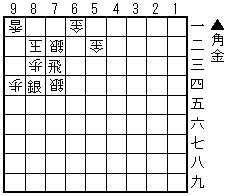 (2)▲6四角△8一金▲7四飛成△7一玉▲7三銀打△9二飛▲8二金△同金▲同銀成△同飛▲同角成△6二玉▲4一飛まで13手必至 |