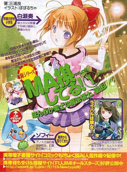 ・巻頭カラーイラスト=4p/本文挿入イラスト=10p・プロローグ=7p 第1章 邂逅、異世界の住人=97p 第2章 発動、将棋魔法=73p 第3章 激突、異種魔法=65p 第4章 暴走、時空の穴=41p ・エピローグ=4p ・あとがき=10p ◆内容紹介 魔法のルールは自分次第! 将棋大好き少女・奏、将棋で参戦!? 異界グノスから落ちてきたオカメインコ(実は魔法学院生ソフィー)と魔法の杖を拾った小学5年生・奏。なし崩し的にグノスの王位継承権争いに巻き込まれた彼女がとっさに発動した魔法、それは「将棋魔法」だった! ※ライトノベルです。 (シアワセノウソツキ−ぽぽるちゃHP) |