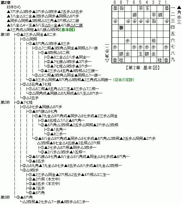 | 横歩取りで△8五飛とさせない形の定跡本。東大将棋シリーズの第11弾。 例によって、ウソのない精密な解説が特徴。二章〜五章が本書のメインで、いわゆる「角交換型急戦」の解説。先手の右銀、後手の右の金銀、飛車の位置のわずかな違いによる変化が詳解されている。六章〜七章は、比較的穏やかな流れの将棋を詳解。 各章の内容をチャートを交えながら見ていこう。本書の4ヶ月前に出版された『谷川の21世紀定跡(2) 横歩取り△8五飛戦法編』(谷川浩司,日本将棋連盟,2002.03)とテーマが似ているので、場合によって比較してみる。 第1章は、横歩取り基本図からの変化の概要。本シリーズでは、目次だけを見てもどのような変化なのか分からないことが多いが、下図を見れば一目瞭然だ。 ![]() 第2章は、後手の中原囲いが完成してから(△5一金と△6二銀が両方指されてから)先手が角交換する形。後手の囲いは安定しているが、8二を守るために△7一銀と戻すことも多く、単純に得ともいえない。 ![]() 第3章は、角交換急戦を警戒して△5一金を先にしている場合に、薄い5筋を狙って角交換から▲5六飛と動いていく作戦。本当の狙いは3筋の桂頭という作戦と、直接5三を破っていく作戦に分かれる。 ![]() 第4章からは、後手が△6二銀を先に上がる形。第1節は2筋と8筋を絡めた先手の急戦策、第2節は穏健派の▲7七桂に後手が激しく反発する形、第3章は比較的落ち着いた展開になる。 「本筋」とされる変化が『谷川の〜』と異なっている部分があるが、これが著者の判断によるものなのか、プロ将棋界の研究の成果(出版年月4ヶ月の差)なのかは、ちょっと分からない。 ![]() 第5章は、角交換に対し、△8二飛と引いて収めようとする形。第1節は▲6六角から▲8四歩と8筋を押さえ、▲3五飛〜▲8五飛と転回を図る形。第2節は▲8七歩と収めてしまい、持久戦調を採る作戦。第3節は▲6六角で斜めのラインを確保し、8筋に歩を打たずにがんばろうという作戦だ。 ![]() 第6章は、先手が▲8七歩と打たずに角交換型をチラつかせている段階で△8四飛と形を決める展開。これには先手も▲8七歩と打ち、以下は「△8四飛型vs▲中住まい3八金型」の流れになる。 ![]() 第7章は、先手がひねり飛車を狙う形。相掛かりからのひねり飛車とは、先後とも玉型が違ってくる。 ![]() この戦型は、現在アマチュアでも大流行している。わたしなどは、△8五飛を目指しても八割方は角交換型にされてしまうくらいだ。この流行が何年も続くかどうかは分からないので、本書は数年後には利用価値が無いかもしれない。しかし少なくとも現在は、居飛車党にとっては最重要課題の戦型だ。横歩取り党は必読である。 なお、東大将棋シリーズは各巻のデザインや背表紙がそっくりで、「どの巻か分かりにくい」と不評だったのだが、横歩取り道場シリーズではちょっとだけ改善されている。(2002July04,2011Mar08改訂(チャート等)) |