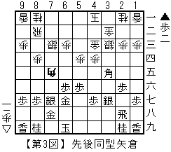 矢倉の先後同型というのは何種類かあるが、ここでは双方が加藤流▲3七銀の構えを取り、さらに双方が角による3筋(7筋)歩交換を果たした図。
