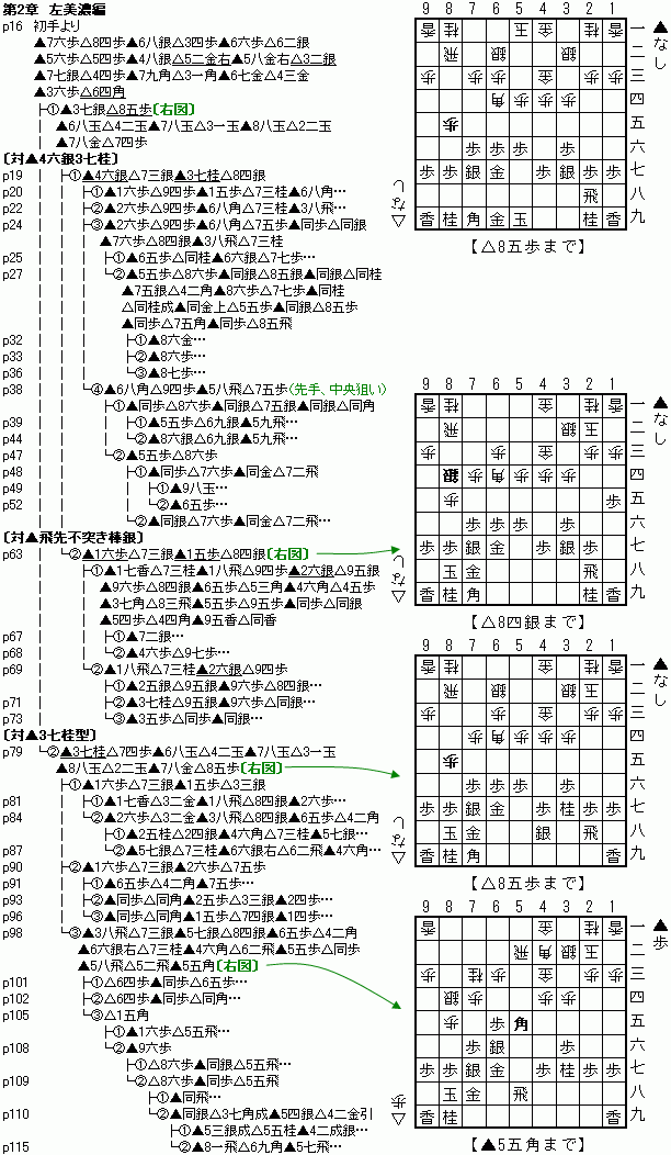 | 矢倉での、後手の左美濃作戦を解説した本。 矢倉戦では、たいていの場合は後手が守勢になる。互いに陣形が似ているため、どうしても先手の方が先に攻めることになりやすい。特に▲4六銀-3七桂戦法に対しては、現在の後手はほとんど専守防衛だ。 後手から攻める戦法もいくつもあるが、米長流などの急戦は攻撃力は高くても玉が薄く、なかなか勝ちづらい。右四間飛車なら攻撃力が高く、玉を固めることも可能だが、単調な戦いになりやすいためか、プロでは主流になっていない。 一方的に攻められるのは、たとえ互角でもつまらない。玉は堅くて、本格的に攻めたい。矢倉らしい、コクのある戦いをしたい。そんな戦法はないか──。そんな方にオススメなのが、本書の「左美濃作戦」である。 第1章は、左美濃作戦の概要について。美濃囲い(高美濃)は矢倉囲いよりも2手早く完成するので、その分を攻めに回すことができる。普通は先手番の矢倉は▲6八銀と上がるため、先手番ではできない「後手番専用」の作戦だ。 〔左美濃作戦のメリット〕 ・飛を切りやすい(△3一銀捨てから両取りをかけられることがない)→猛攻しやすい ・角を使いやすい ・▲4六銀-3七桂に強い(3三に目標となる銀がいないため) ・端を破られても逆サイドに逃げやすいことがある(p70参考図など) ・△5二飛と回ったとき、飛にヒモがついている(p100など) 〔デメリット〕 ・端(1筋)が弱い(3三銀の応援が利かない) ・玉のコビンが弱い 第2章は、左美濃の良さを生かした戦い方について。この戦型では、先手も手数の差を縮めるために早囲いで来ることが多い。このときに、後手が居玉のまま7筋の歩を交換する佐藤康光流もあるが、本書では割愛。本書の「中田宏樹流」では、7筋の歩交換は保留し、△6四角と出て、先手が▲3七銀か▲3七桂かを問う。 ▲3七銀の場合は、次の△8五歩が大事な一手(p17〜p18)。先手の攻めの形は、▲4六銀-3七桂(p19〜)か、▲飛先不突き棒銀(p63〜)かだ。いずれの場合も、後手は終盤で強い攻めを敢行できる。美濃が残っていれば、駒損しても攻め続けられれば反撃は来ない。対抗形で穴熊が得意な人は、似た感覚で攻めをつなげられそうだ。 ▲3七桂の場合は少し注意が必要。1筋を詰められたら、美濃を崩してでも△3三銀と端を強化(銀の援軍を送れるように)しておく。ポイントとして、「△3三銀と上がるときは、立ち遅れて守勢にならないことが絶対条件」(p81)となる。 ![]() 第3章は、先手の▲2五歩早突き作戦。現代矢倉では、先手は飛車先不突きor保留で進めることが多いが、後手の左美濃からの強襲が強力なので、早めに▲2五歩を決めて左美濃を崩させ、後手の攻勢を防ごうというのが狙いだ。デメリットは、先手の作戦の幅が狭まること(もともと飛先不突き矢倉は、飛先を伸ばす手数を他に回すのが一つの狙い)。▲4六銀-3七桂やスズメ刺しは使えなくなる。 これに対して、後手が2筋歩交換を許せば作戦負けを招く(p122〜)。また、左美濃を崩さないようにと△3三金と受けるのも後手思わしくない(p126〜)。結局、左美濃を崩して△3三銀と受けるしかないが、その場合も△7三銀型では後手にいい変化がない(p130〜)。 そこで、後手は飛先を△3三銀で受け、△7三角型にして先手の攻めを牽制する。攻撃力は落ち、「左美濃の堅陣から猛攻」という本来の戦い方はできなくなるが、先手の作戦を限定させて、専守防衛にならないだけでも良しとする考え方だ。 後手の対抗策は次の2つ。 (1)△7三角-△5三銀-△6二飛型から△6五歩と仕掛け、角交換後に△4七角と打つ。(p149〜) (2)△7三角-△6三銀ー△8二飛型から△6五歩と仕掛ける。(p168〜) この2つなら後手も十分戦えるという結論だ。ただし、「(角交換後の)角の使い方や打ち場所のちょっとした違いで変化手順が大きく違ってくる」(p177)ので、何度も試して勘をつかむ必要がありそうだ。 ![]() この戦型では、互いに棒銀の形になることが多い。右図のような形から▲1五銀と出て、放置すれば銀交換して成功なので△1四歩と追い返そうとする。このとき、攻め方が2種類ある。(1)▲2六銀〜▲1五歩と攻める (2)▲1四同銀と取る 中級者向けの手筋の本では、「(2)の方が良い」と書かれていることもあるが、本書では(1)の方が出現率が高い。(2)の場合、すぐに銀を取ってくれれば1手早くなるが、そのままにしておけば相手は好きなときに銀を取れるし、端攻めについては手が遅れるというデメリットがある。一方、玉頭にプレッシャーをかける形なので、相手が△4五歩としたときに▲同桂と取りやすく、1歩得というメリットもある。 それぞれの特徴をよく考えて使い分けるように必要があるので、それを頭に入れながら本書を読み進めるとよいと思う。 本書の解説は、「マイナビ将棋BOOKS」としては標準的なレベル。プロレベルのテーマについては難しい部分もあるが、ときどき指し手の意味や複雑な形勢判断を明快に言語化していて、理解しやすかった。例として、p136を一部引用しておく