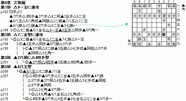 | 角交換四間飛車破りの解説書。 角交換四間飛車が最初に指されるようになったのは2003年ごろ。当初は、後手番の上に2手損する作戦を疑問視する向きもあったが、徐々にその優秀性が認められていった。そして、序盤の大家・藤井猛九段が独自の工夫を加えて連採するようになり、後手振飛車の主流の一角に食い込みつつある。 本書は、流行中の角交換四間飛車に対し、居飛車の指し方を解説した本である。 各章の内容を、チャートを添えて紹介していこう。 第1章は、後手の成功例を用いて、角交換四間飛車の狙いを2つ紹介。大きく分けて、「向飛車〜△2四歩からの逆棒銀」と「4筋の歩を交換してからの4筋棒銀攻め」である。なお、角交換四間飛車には、他にもいくつかの狙いがあるのだが、本章では省略されている。 ![]() 第2章は、最短での▲2四歩が成立するかどうか。先手が歩交換した瞬間に後手から角交換して、角交換系の振飛車では定番の対策が3つある。本書では「力将棋が好きな人は一度試してみるのも面白い」(p34)とあるが、基本的には居飛車が好んで飛び込む変化ではない。 なお、後手の立場でいえば、6手目に角交換してしまえばこれらの変化のリスクはなくなる。『角交換四間飛車 徹底ガイド』第5章(角交換四間が後手番)では、6手目に角交換している。 ![]() 第3章〜第5章は、先手がどの筋の歩を突いていくかで展開が分かれている。なお、2筋の歩を▲2六歩で保留する指し方もあるが、本書では2筋はすべて突き越している。 第3章は、▲3六歩型。早繰り銀や超速のように右銀を繰り出し、3筋を攻めたり、左銀も繰り出して中央を制圧したりするのが狙いとなる。 ただし、右下図の△8二玉では、△7二玉型のまま△2二飛と転戦してくる可能性が高いと思われる。 ![]() 第4章は、▲4六歩型。「角換わりに5筋を突くな」という格言もあり、対角交換四間ではもっとも自然な構えである。逆棒銀には▲3七桂で受け、△4四銀からの3筋攻めには袖飛車で対応する。△4四歩からの4筋攻めには、後手陣の状況に応じて対策を変える。 なお、『角交換四間飛車 徹底ガイド』の第5章で提案された「△3筋位取り」に対する回答は本書にはない。 ![]() 第5章は、▲5六歩型。銀を中央に使いやすく、△4五歩に▲5七銀を用意できる。また、本章では5筋位取りを狙っていく展開もある。半面、△3九角の筋には注意。これを警戒して、▲5七金と立つ駒組みもある。 ![]() 第6章は、対穴熊。角交換四間飛車+穴熊は特に「レグスペ」と呼ばれ、『角交換振り穴スペシャル』(東大将棋部,MYCOM,2008)などで詳しく解説されている。本章では、▲3七銀型から▲3五歩△同歩▲4六銀と仕掛けていく筋をメインとした攻略法を提案している。 ![]() ●総評 正直に言っていいですか? ちょっと厳しいですが、期待はずれでした。 ・対象棋力はアマ初段程度とのことだが、ココセで局面を分かりやすくしていることが多い。(※1) ・居飛車(先手)が序盤でどの筋の歩(▲3六歩/▲4六歩/▲5六歩)を突くかによって章が分けられているが、それぞれの狙い(攻め/受け)や特徴(長所/欠点など)がまとめられておらず、どういう思想で指していくのかが分かりにくい。 本書出版の2か月前には、『角交換四間飛車 徹底ガイド』が刊行されている。角交換四間側について原理や狙いが明確に書かれており、角交換四間を指したいという気持ちにさせてくれる良書だった。逆に、居飛車を持ったらどう指してよいかわからず、困った。 ・『〜徹底ガイド』第2章(角交換四間が先手番)と似た変化がいくつかあるので、見比べるとよい…が、本書では『〜徹底ガイド』で「角交換四間側が失敗」とされた変化を「居飛車成功」として解説しているものの、『〜徹底ガイド』が角交換四間側の対策として示した変化については触れられていないことが多い。大部分で、本書は『〜徹底ガイド』のダウングレード版になってしまっている。 本書に期待していたのは、「角交換四間に対抗する有力な戦型や思想」だったのだが、実際は大部分が「後手に甘い手を指させてボコボコ」にしていた。ココセ自体は解説のために必要なこともあるが、「これ(ココセの展開)は困るので、相手は○○としてくる」と続くべきだと思う。 または、初段クラス(本書の対象棋力)がやられやすい形を示し、その対策として○○とすれば戦える、という形式でもよかっただろう。本書でも第1章で後手の成功例を示しているが、その対策としてどうすればよいかはあいまいになっている。 角交換四間側の無理な動きの咎め方は参考になるが、居飛車からの仕掛けについてはこんなに上手くはいかないと思った方がよいだろう。あえていえば、「角交換四間に対しては、こういう攻め筋があるということを参考にするための本」である。 内容紹介にあるように、「にわか仕込みの角交換四間飛車はすべてカモにできる」だろうが、少し経験を積んだ角交換四間飛車(『〜徹底ガイド』を読んで実戦で試したレベル)