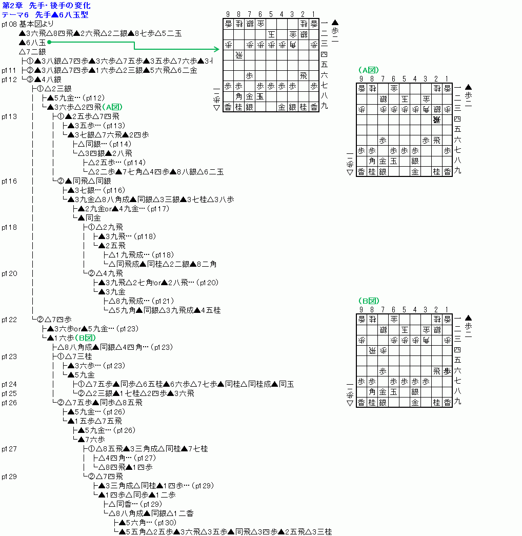 テーマ6は、「先手▲6八玉型」。 どちらかといえば持久戦志向で、将来的に左辺に逃げ込みやすく、▲7八金にもヒモを付けている。戦場になりやすい3筋からは一路遠い。半面、バランスはイマイチで、7筋・8筋攻めの当たりが強く、5七も強化しにくい(▲6八銀と上がれない)。 右辺の形は▲3八銀型と▲4八銀型がある。「後手に恐い変化も多く、強く戦う覚悟が必要」(p130)。 ![]() |