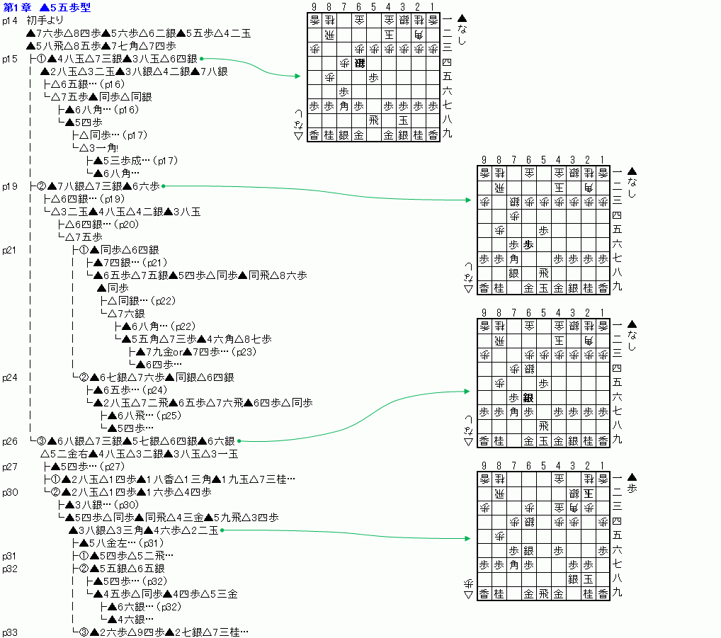 第1章は、「▲5五歩型」。 中飛車で5筋位取りができるならやってみたくなるが、それは本作戦の待ち受けるところ。 ・「超速▲3七銀」を後手番で応用する。角道を開けずに△4二玉のまま△7三銀と上がる。 ・仕掛けができそうなら、△3一玉型美濃囲いではなく、△4二銀型の舟囲いでもよい。 (※2019年2月現在の視点なら、elmo囲いとのミックスもありそうだ) ・▲6六銀型には急戦はできないので、△3一玉型左美濃にする。 ・先手が穴熊なら、△1三角の端角が有力。角のニラミで、先手は左金を囲いに引き付けることができない。 ・先手が美濃囲いなら、端角にはこだわらず、△4四歩から高美濃を目指す。 ![]() |