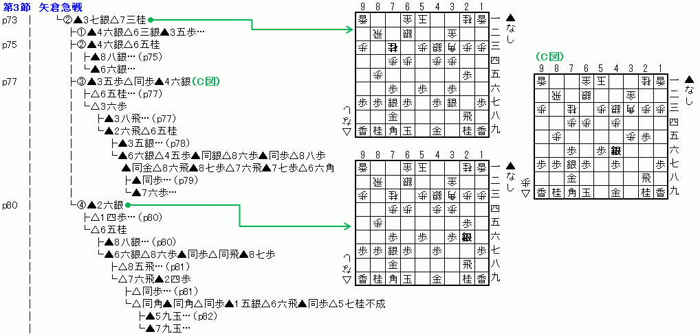 第4章は、「矢倉右玉」。先手が角道を止める矢倉戦で、後手が右玉を目指す。 (1)駒組み ▲7九角の瞬間は、先手からの2筋強襲に注意。△3三銀-△3二金が間に合うようにしておく。 ![]() |