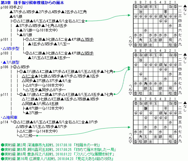 | 第1章は、「角換わりからの雁木」と題しているが、実質的には「角換わり拒否からの雁木」。角換わり模様に進んだときに、後手が△4四歩と角道を止めて角交換を拒否し、以下雁木に進むときの展開を解説。本書のメインコンテンツとなる。 ・ツノ銀の新型雁木は、左右どちらにも囲える。(右玉も可能) ・△5三歩型は、先手の角筋(▲2六角など)をあまり恐れなくてよい。(※対雁木の攻め方の一つとして、引き角から3筋の歩を交換し、▲2六角と引くものがある) ・矢倉の▲7七銀は、△6五桂が当たる位置にいる。新型雁木は銀が相手の桂に当たらない。 ⇒雁木の方が右桂の活用が速そう。 ・新型雁木は5三に銀を置かないことで、引き角の活用がスムーズにできる。 ・雁木は角交換は歓迎。角の打ち込みに強い。矢倉は4九などに角の打ち込みのスキがある。 ・雁木は左桂も使いやすい。 ・雁木は△3三金と受ける形もある。(※早繰り銀に対し、△4二角〜△3三金!が雁木特有の一つの受けの形。稲葉も流行初期のころにはこの受け方を知らなかったことが実戦編に書かれていた。) ・桂当たりがなさそうなら、△5三銀型もあり。 ・腰掛け銀型は攻め味では優り、角交換に強く、桂が当たらない。 ・△4二玉型は、5三の地点をカバーする。 ・雁木は、相居飛車ならどのような出だしでも組める。互いの合意は不要。 ・早繰り銀+▲5六銀の二枚銀は、他の戦型ではほとんど見かけない珍しい形。バリエーションの一つとして知っておこう。 なお、第1章〜第3章の共通の特徴で、分岐のところで同じ変化が何手も続いていることがあり、どこで手が変わったのかが分かりにくいことがときどきある。一応、下記のチャートでは下線を引いて分かるようにしてみた。 ![]() |