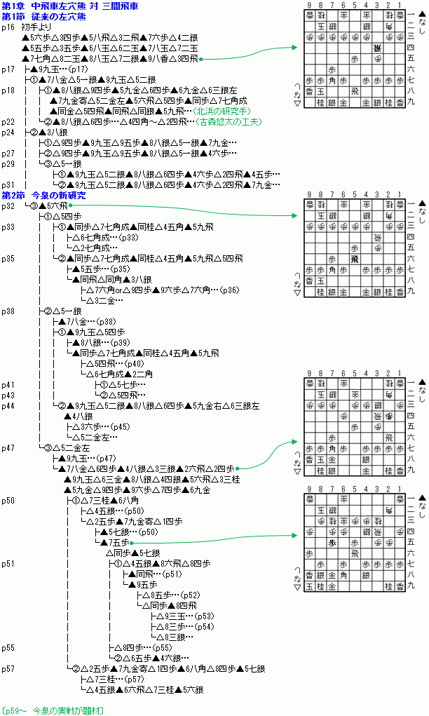 三間飛車」。 (1) 従来の左穴熊 △5一銀型からダイヤモンド美濃にして、△5四歩と動く作戦が難敵。△5一銀型には左穴熊が苦労している。 漫然と駒組みすると将来的に堅さ負けするので、左穴熊を簡単に済ませ、▲4六歩〜▲4七銀を急ぐのは有力。ただし、▲4六歩に△2四飛として▲3八銀を釘付けにされると、先手不満。 (2) 今泉の新研究 原点回帰の▲5六飛が有力と見る。 ・△5四歩の仕掛けが気になっていたが、左穴熊にはできなくとも低い陣形で十分戦えると判断するようになった。 ・△5一銀型にも、角交換の仕掛けは恐れない。陣形が低ければ大丈夫で、▲2二角の打ち込みを切り札に狙う。 ・△5一銀型で、後手が仕掛けを見送るなら、左穴熊に組める。「穴熊版・中原囲い」が有力。 ・△5二金型には、▲2六飛が常套手段。△2四歩と突かせて、将来の△2四飛を消す。 ・▲5六飛に強敵の△4四銀型には、「▲7五歩!〜▲5七銀」が眼目の仕掛け。穴熊を頼りに左辺で暴れ、途中で銀が入手できれば▲2三銀(飛角両取り)を狙う。 p59〜からは実戦ベース。 @△4四銀型〜▲4六歩△3六歩(p59〜) 以前の左穴熊では、「右辺は銀桂に任せて玉を固める」という指し方もよく見られたが、現在は「右辺に金銀を残してでも、後手の捌きや押さえ込みに対抗し、少しずつ金銀を使っていく」といった展開も必要。 A△3二飛型からの△3六歩(▲4六歩の前に)(p64〜) 強敵の一つだが、戦える。 B△居飛車模様(p73〜) △7四歩〜△7三銀と進出し、玉を左に囲ってくる作戦。7六歩を銀で狙ってくるが、あまりこだわる必要はなく、5五を確保することの方が重要。 ![]() |