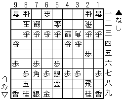 | (4) 対 △5四歩型持久戦 ・2手目△8四歩〜△8五歩〜△5四歩から、後手が中央に金銀を並べて持久戦を目指す形。 ・先手は▲6六銀〔右図〕から、好機に▲5五歩〜▲4五歩と仕掛けよう。 |