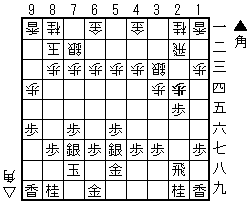 | (1) 対 急戦 ・▲4五歩の仕掛け〔右図〕は、角交換から▲3一角の馬作りが狙い。 ・後手はあえて馬を作らせて、好所の△4四角を打つのが有力。 |