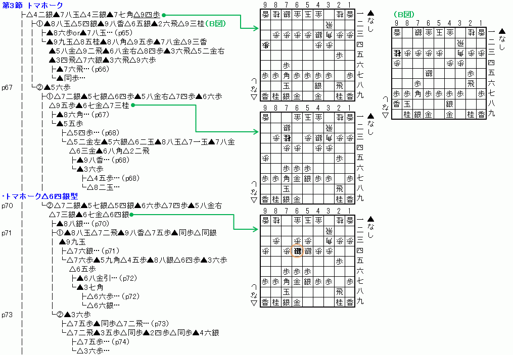第2節 △6三歩型△5四銀 △6三歩型と△5四銀の組み合わせが最近現れた形。先手から▲6五歩と仕掛けたときに、歩がぶつからないのが後手の主張。 ![]() |