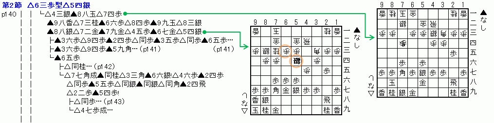 第5節 △4五歩型 後手は△4二銀型で、飛先逆襲ではなく角交換を挑む。先手は角交換に応じ、バランスを取りながら居飛穴に潜る。 ![]() |