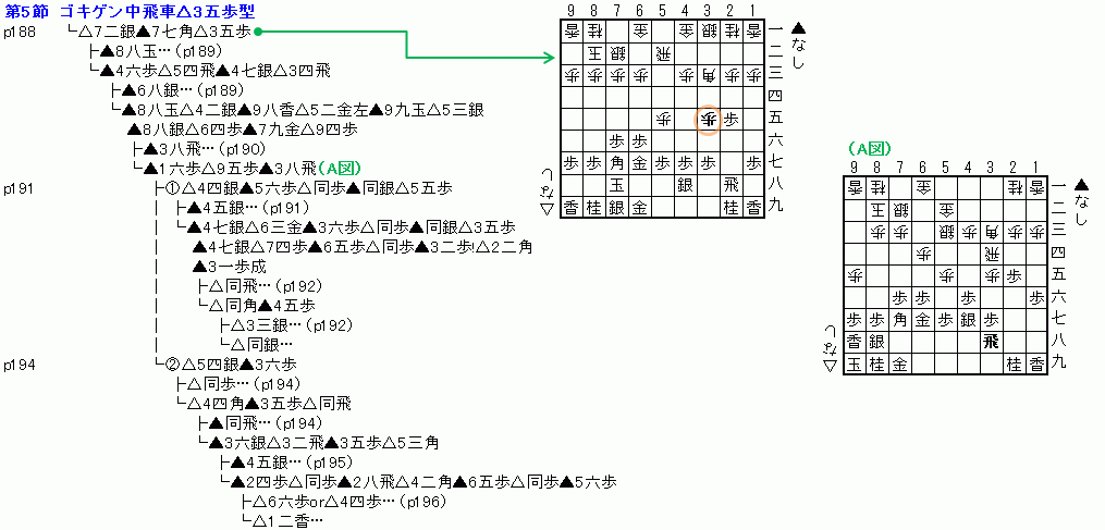 第4章は、「対 中飛車」。 第1節 △4三銀型 角道を止めた△4三銀型の中飛車は守備的。左金を△3二金とバランス重視で使うか、形を決めずに△4五歩か、高美濃にして堅さを求めるか。居飛穴側は、囲いが整うまでは角交換に応じないように。 ![]() |