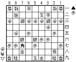 5-2 新旧対抗型 「△6二金-8一飛型(新型)」vs「▲5八金-2八飛型(旧型)」の対抗形。 テーマ図から△6五歩▲同歩△同桂▲6六銀△6四歩とちょっかいを出しておく。「新型」の方がやや優勢と見られているが、明確な結論は出ていない。 |
