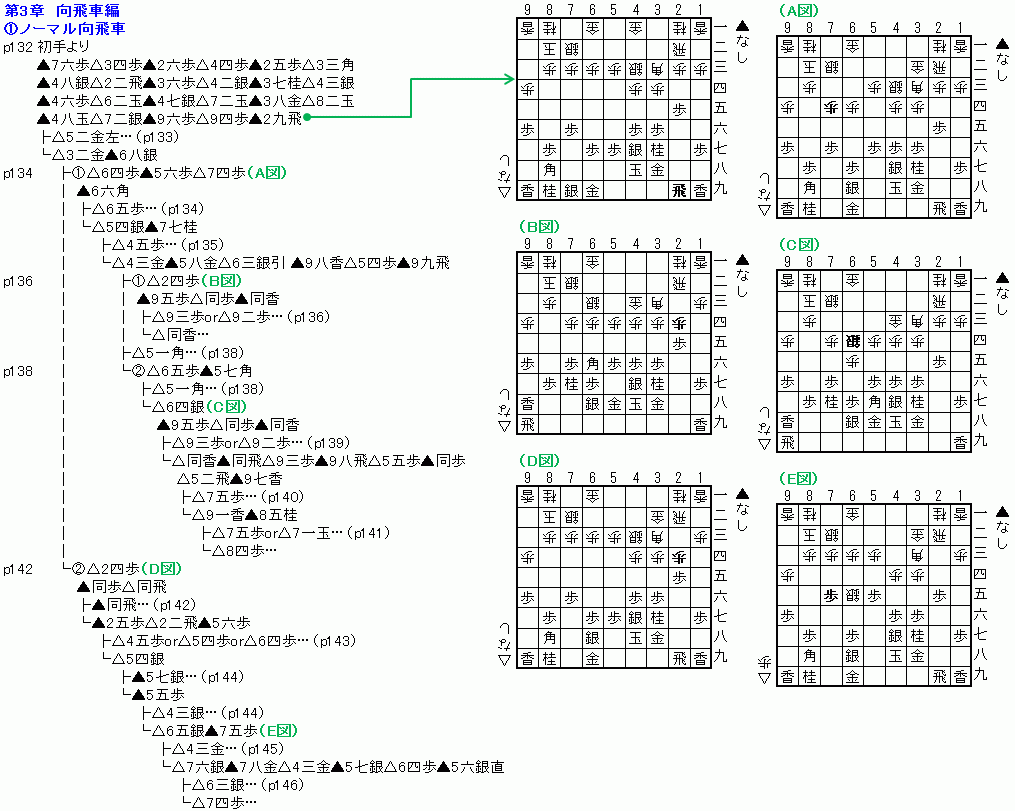 第3章は、「向飛車編」。角道を止めたノーマル向飛車と、角交換型向飛車がある。 (1)ノーマル向飛車 ・角道を止めた向飛車には、▲3六歩〜▲3七桂〜▲4六歩〜▲4七銀〜▲3八金〜▲4八玉〜▲2九飛と組む。 ・持久戦なら左辺で動く。地下鉄飛車からの端攻めが有効。 ![]() |