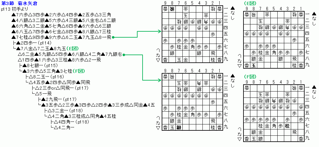 (2)穴熊 ・角換わり腰掛銀模様から、後手が右玉にした場合。 ・後手は「一人千日手」で待ち続ける。 ・先手は、銀矢倉から穴熊に組み替える。 ・穴熊の堅さ、深さを生かして、部分的にはやや無理気味の仕掛けを行う。 ・本譜の攻めは多少先手側(穴熊側)に贔屓した変化だそうだ。 ・じっくりした戦いが好きな人は、▲3六歩を突かずに、先に▲4五歩と位を取り、穴熊に組んでから▲4六角の設置がオススメ。角のニラミで全局を制する。 ![]() |