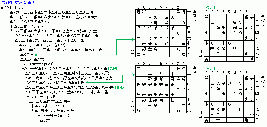 (4)菊水矢倉? ・本節では▲7七角から菊水矢倉に組む。 ・▲4六歩で△4五歩を消し、穏やかな展開にする。 ・△8二玉には、上部に厚い銀冠へ組み替え。 ・後手の仕掛けがなさそうなら、さらに堅く組み替えていく。 ・やはり、右玉側の仕掛けを封じて、自分だけ堅く組み、暴れていくのがポイント。 ![]() |