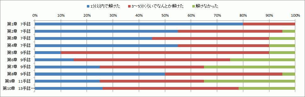 | 7手詰〜17手詰の詰将棋問題集。家庭雑誌『家の光』(外部リンク)に1959年(!)9月号から連載された詰将棋のうち、7手詰〜17手詰をまとめて書籍化したもの。 〔問題の傾向〕 ・問題図には、ヒントが1〜2行。ヒントを見た場合は難易度がグッと下がる。どれくらい下がるかというと、わたしでも7手詰が1分以内でだいたい解けてしまうくらい(笑)。ヒントはページの下段にあるので、「ヒントなど要らぬ!」という人は隠してください。スマホだとちょうど親指で隠せる感じです。 ・手数は各章タイトルで分かる。ただし、第10章は「13手詰め」となっているが、第188問は17手詰、第201〜203問は15手詰。13手詰だと思っていると泥沼にはまるので要注意。 ・解説は80〜120字程度と図面2枚で、まずまずの詳しさ。ただし、第3章〜第5章はなぜか解説文が短い(20〜40字程度)ものが多い。 ・解いてみた印象では、手数ごとの難易度が10段階だとした場合、Lv.4〜6で標準的なものが多かった。比較的近接型で、詰め上がりに安心感があるものが多い。 ・問題が各章で20問ずつ(第10章のみ23問)分かれているが、特に難易度やテーマで分けられている訳ではなさそう。どういう分け方なのかは不明だった。 ・打歩詰め打開は計13問(全体の6.4%)。だいたい各章にあり、0〜3問ずつ散りばめられている。ヒントに打歩詰めが発生する旨が書かれている。 ・邪魔駒消去が結構多い印象。 〔実際に解いてみた〕 なお、わたしの「詰め棋力」は、甘く見積もって三段、厳しく見れば初段くらいです。(指し将棋全体の棋力よりもかなり劣ります(汗)) 直前に解いていた詰将棋本は『3手詰修了検定』。難しめの3手詰と、本書とほぼ同じ7手〜23手の3x3マス詰将棋を含んだ本でした。 解いてみた結果はこんな感じ↓。 ![]() 難易度的には、ちょっとずつ難しくなっている…のだろうか? 第1章(7手詰)はかなり調子よく解けており、第2章〜第4章(7手詰)はおおむね同じ難易度っぽい。第5章〜第8章の9手詰は、第5章・第8章はまずまずで、中盤の第6章・第7章は苦戦気味。最後の第10章(13手詰〜17手詰)は9手詰編の平均程度なので、9手詰以降はさほど難易度が変わっていないっぽいです。 というわけで、「どんどん難易度が上がって苦しくなる」ということはなく、「一つ解けなくても、次また頑張ろう」と思えるような問題集でした。 〔総評〕 問題数は203問と多めで、難易度も今のわたしにとってちょうど良く、個人的には大満足の一冊でした。 ただし、詰将棋本は全然歯が立たないとまったく面白くありません。電子版の無料サンプルが第18問まで見られますし、Amazonの紹介イメージでも第3問まで見られます。サンプルがサクサク解けた方にはオススメです。 (2019Dec14) ※誤字・誤植等(初版第1刷・電子版ver.1.00で確認): p10 ×「同竜と読んで」 ○「同竜と呼んで」 p286 ×「2四飛成」 ○「2四竜」(すでに成っている) |