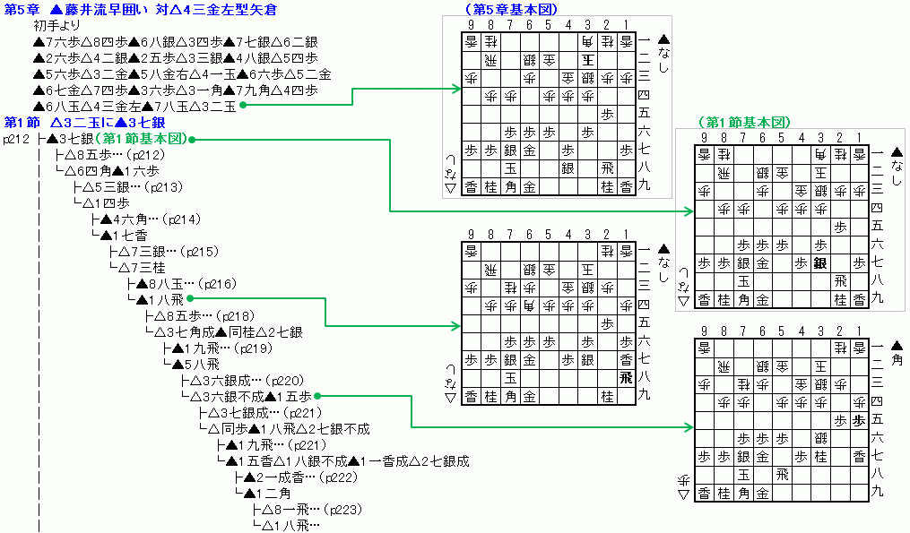 第3章は「▲6七金左型矢倉 同型」。先後双方が6七金左型矢倉を採用し、同型で非常に難解。 第1節は「△3二玉に▲3七桂」。先手が攻撃形を▲3七桂に決める。後手は△7三銀も一局だが、本節の本線は△7三桂からの同型。互いに▲4六歩〜▲4七銀〜▲2九飛の形を作る。仕掛けは▲4五歩からで、攻めがつながるかどうか。 ![]() |
