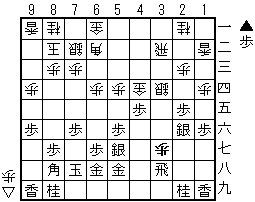 (4) 角交換型 ・▲中飛車に対し、角交換はするが5筋歩交換はさせない作戦。 ・ミレニアムの堅陣に組んで、攻めの主導権を得ようとする作戦〔左図〕が新しい。角交換後に持久戦にしても、攻めは例の自陣角(△7三角)で打開できる。 |