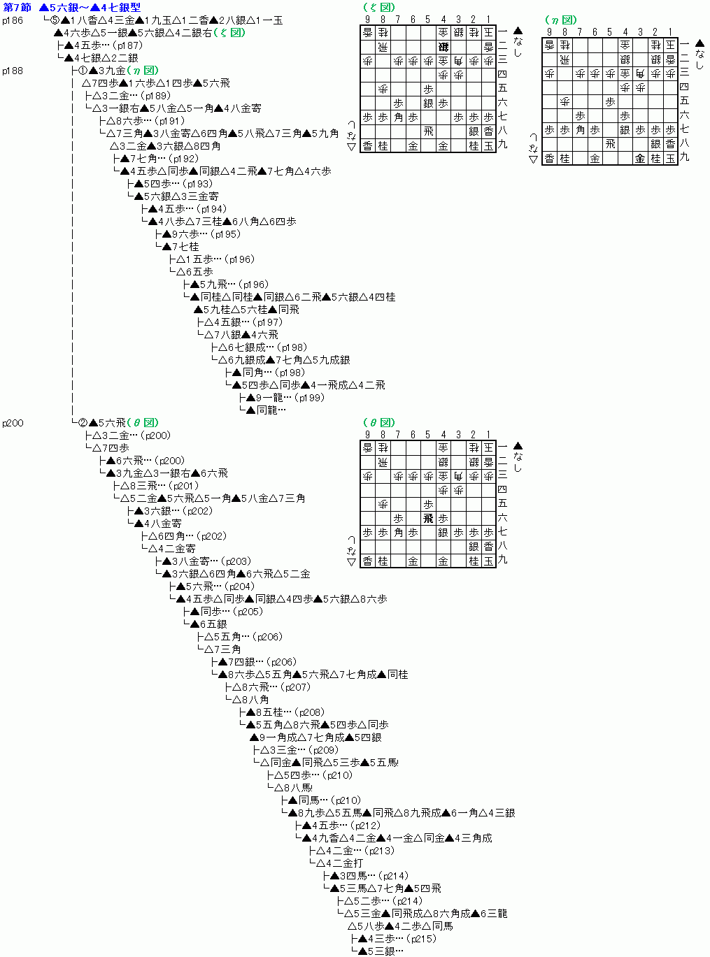 第6節は、「▲4六銀・5六飛型」。 ・▲4六銀・5六飛型は、先手がディフェンスラインを上げた状態で捌きを目指す。後手が△5四歩と反発した時に5五が厚いのが特徴。後手は△8四飛と守るべき。 ![]() |