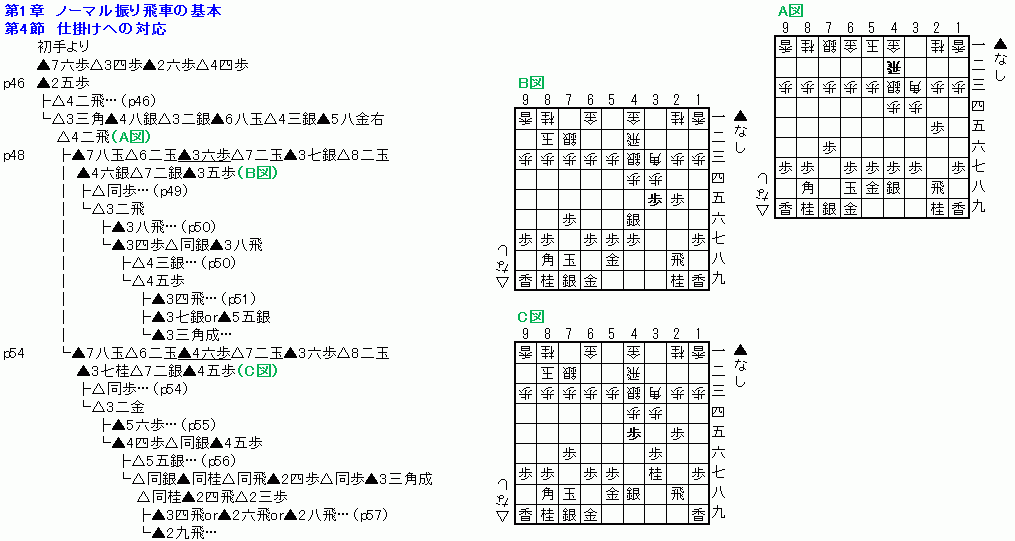 第1章は、「ノーマル振り飛車の基本」。 ノーマル振り飛車では、振り飛車側が角道を止めて比較的穏やかな序盤戦になるので、互いに囲ってから戦いが始まるケースがほとんど。なので、よく使われている囲いの急所を先に解説して、次にノーマル振り飛車の一般的な指し方の考え方を解説していく。 (1)振り飛車美濃囲いの急所(難易度★2.0〜2.5) 美濃囲いの長所、よくある攻められ方、受け方の例を解説していく。(※本書では振り飛車穴熊については扱わない) ・囲いは5手(本美濃)で完成。 ・横からの攻めに強く、発展性(進展性)がある。 ・上からの攻め、端攻めには弱い。 −△5五角のライン+桂でのナナメからの攻め −一段飛車+△6六角のラインで△3九Xを狙う −端攻め+△2四桂は思った以上に速い。△1六桂と香を取った手が王手になる。 ⇒△2四桂を打たせないように、端を取り込ませて▲1八歩と謝るのも一考の余地あり。 ・高美濃に組み替えると、本美濃の弱点が一部補強される。ナナメのラインが緩和され、上部への逃げ道も広がる。 −組み替え中は薄くなる部分もある。(囲いのことだけをいえば)▲4六歩〜▲3六歩〜▲4七金の組み方を推奨。 −右桂を跳ねて攻撃に使うこともできる。半面、桂頭攻めに注意が必要。特に△6九角の筋には注意。 ・銀冠まで組み替えると、桂頭が厚く、端攻めにも強くなる。 −▲2七銀の瞬間は危ういので、組み替えられるかどうかの見極めが必要。 −下段飛車にも弱いので、▲3九香などの補強を考えておきたい。 (2)様々な居飛車の囲い(難易度★2.0〜2.5) 居飛車でよく使われている囲いの長所・短所、崩し方の例を解説していく。 ・舟囲いは完成まで4手。 −いろいろな形に組み替えていくことができる。 −角頭(2三)は弱い。 −玉頭(3筋)も急所。高美濃側から▲3五歩が速い攻め。 ・エルモ囲いは手数がかからず堅い。 −飛車打ちに強い。 −居飛車から端攻めをしやすい。囲いの桂も戦力になることがある。(※天守閣美濃などでは端攻めがしづらい) −2三は(舟囲いと同様に)弱点だが、逃げ道がある。 −2三と4三を同時に狙う(▲3四銀や▲3五桂)のは有効。 −玉頭攻めも有効だが、振り飛車が高美濃に組む前にエルモ囲い側から仕掛けてくることが多い。(逆にエルモ囲い側はあまりゆっくりしない方が良さそう) −ただし進展性に乏しく、持久戦には不向き。 ・トーチカ囲い(ミレニアム)は手数がかかるが、比較的安全に堅く組める。 −本書ではトーチカとミレニアムは区別されておらず、別称扱い。 −玉が低くて深い。 −囲いの桂を攻めに使うことができる。 −金銀4枚で囲えるが、攻めの細さに注意。 −桂頭(3四)は弱点だが、3筋を攻めると反撃が来やすい。金銀4枚で囲われていると桂頭を攻めても効果が薄いので、桂頭を攻めるなら右銀が囲いにくっつく前に攻めたい。 −と金攻めは効果的。(居飛穴よりも)5筋の垂れ歩が厳しいので、5筋の歩は切っておきたい。 ・穴熊囲い(居飛車穴熊)は玉が遠くて堅く、王手がかからない形(ゼット)を生かした寄せが狙える。 −穴に潜るときに、玉が角のラインに入りやすいので、振り飛車からの猛攻がある。 −居飛穴に端攻めは有効。ただし、本美濃や高美濃だと△1六桂の反撃が厳しいので、銀冠まで囲っておきたい。 ・銀冠穴熊は手数が相当かかるが、組む途中で戦いになっても堅い。 −端の弱点もない。 −銀頭は急所なので、2筋攻めは効果的。ただし反動には注意。 −2二金を狙うために、歩のテクニックで周りの金銀の形を乱そう。 なお、最近多い「天守閣美濃ではない左美濃」については本章では触れられていない。 (3)玉を寄せる仕組み(難易度★2.0〜2.5) 対抗形での寄せは、[玉を下段へ追い込む]と[玉を端へ追い込む]が2大パターン。 ・むやみに追い掛け回さず、逃げ道を塞ぎたい。 ・上から攻める方が効果的。桂香歩も使って攻めることができる。横からの攻めは高い駒しか使えない。 ・美濃囲いを高美濃に進化させるのは、堅くする意味ではなく、上からの攻めに強くなり、自分からも攻めることができるようにするため。 ・居飛穴やトーチカは、高美濃や銀冠(の上からの攻め)に対抗できる囲い。半面、玉が最初から下段にいるので、逃げ出すことが難しい。 (4)仕掛けへの対抗(難易度★2.0〜2.5) ノーマル振り飛車の基本的な考え方を解説する。本節では、四間飛車に対して、居飛車がシンプル舟囲いから5筋不突きでの急戦を仕掛けてきた場合の、振り飛車の捌き方を解説する。 −▲4六銀〜▲3五歩の仕掛け(角頭を攻める)と、▲4六歩〜▲4五歩の仕掛け(角交換をして飛先突破を狙う)を解説する。急戦の仕掛け筋としては、汎用性が高く、頻出。 −「居飛車が一応囲った上での急戦」としては、どちらもほぼ最速の仕掛け方。(級位者でよく見られる「居玉棒銀」は載っていないが、応用可能) −有段者ならもう少し準備を整えてから仕掛けることになる。なので、本書と同じ形はあまり定跡書には載っていない。 ⇒捌きのイメ