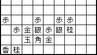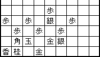・矢倉の番外編#14。 ・三段目に金銀をズラリと並べる。 ・角落ち上手で現れる。 |