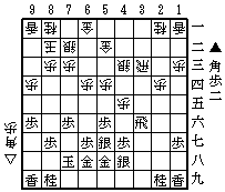 A図から△4五歩▲3三角成△同飛▲8八角△4六歩▲3三角成△3七歩と進んだ局面がA4図。▲同飛に△3六歩の連打が狙いで、比較的新しい手。 |