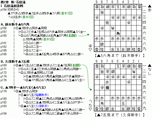 | 角交換系振飛車の定跡書。メインはゴキゲン中飛車と石田流。 久保は「捌きのアーティスト」の異名を持ち、説明するまでもなく、現代振飛車の第一人者である。そのメインウェポンは、先手番では石田流、後手番ではゴキゲン中飛車。以前は四間飛車も使っていたが(定跡書も出している)、現在のスタイルになってからのほうが持ち味が出ているように思う。 本書は、角交換形の振飛車について、比較的俯瞰的に書かれた定跡書である。 ●特徴 ・振飛車が後手番の戦法(△ゴキゲン中飛車、2手目△3二飛戦法)は、振飛車が手前で先後逆表記になっている。 ・プロ公式戦から消えた変化について、消えた理由を詳しく書いてあることがある。 例) 対ゴキゲン中飛車の▲5八金超急戦での▲7五角 鈴木式早石田の△5二玉 石田流の久保新手▲7五飛での▲4五飛 石田流vs△棒金での▲7七桂 ...etc. ・ボリュームは多め、コストパフォーマンスはいまいち。本書の版型はA5サイズで、棋書で一般的な四六版よりも一回り大きいが、1ページあたりの情報量は他の棋書(たとえばマイナビの「よくわかる」シリーズなど)とほとんど変わらない。フォントが大きく、余白も広いためだ。なので、純粋な情報量は、一般的な棋書(四六版で222p)の1.3倍程度。ハードカバーとはいえ、税抜2,600円の価格設定は、かなり割高感がある。1,800円くらいが適正価格だろう。 ・参考棋譜が22局と多め。解説は将棋年鑑よりちょっと手厚いくらいだが、本文の先を補完している。例えば、「先手良し」からでも実戦的には難しかったり、逆転の余地があったり、ということが棋譜を並べると分かる。 ●他書との比較 先行して発売された他書に比べて、優れている点もあるし、明らかに劣っている点もある。 ○ゴキゲン中飛車 ・▲5八金右急戦: 本書は▲6五香打で終わっているが、『速攻!ゴキゲン中飛車破り』(中村太地,MYCOM,2011.09)、『最新の振り飛車対策』(深浦康市,日本将棋連盟,MYCOM,2011.10)には▲6五香打の先も書かれている。また、▲7五角が消えた理由は 『遠山流中飛車急戦ガイド』(遠山雄亮,MYCOM,2010.07)とは異なっている。 ・超速: 『速攻!ゴキゲン中飛車破り』の方が断然詳しい。 ・丸山ワクチン: 『よくわかる角交換振り飛車』(横山泰明,MYCOM,2011.08)の方が詳しくて分かりやすい。 ・▲7八金型: 『早分かり 中飛車定跡ガイド』(所司和晴,MYCOM,2011.06)では浅かった部分が本書では詳しい。 ・▲ゴキゲン中飛車: 『戸辺流現代振り飛車手筋集』(戸辺誠,MYCOM,2011.06)と比べ、一時期流行した▲6六銀〜▲7七桂で△8九角と打たせる形(p95〜p97)が詳しい。研究が進んで居飛車良しになっているので注意。 ○石田流 ・石田流久保新手▲7五飛: 『久保の石田流』(久保利明,日本将棋連盟,MYCOM,2011.03)で触れた「△7四歩に▲4五飛」は本書では否定。▲同飛を本線としている。 ・▲7四歩〜▲5八玉(or▲4八玉): 『久保の石田流』第8章より少し詳しく書かれている。 ・升田式石田流: 近年現れた「▲8六歩の仕掛け」の成否はかなり詳しく検討されている。従来の升田式とは少し違う序盤についても『久保の石田流』よりも詳しい。 ・久保システム: 角道を止めて、石田流本組にできた場合の組み方。石田流復活の原動力の一つとなった「棒金対策」と「左美濃対策」について。 ○2手目△3二飛 『久保の石田流』第7章と、内容はだいたい同じ。4手目△4二銀は本書も記載なし。 ○升田流向飛車 この戦型は『高崎一生の最強向かい飛車,』(ア一生,MYCOM,2010.03)の方が非常に詳しい。本書の内容もほぼカバーされている。参考棋譜もなし。 ●総評 ▲ゴキゲン中飛車と石田流全般について、最新の状況を知りたい方は「買い」。ただし、通常の定跡書2冊分のお値段なので、財布と相談してください。△ゴキゲン中飛車だけ興味があって、他書もしっかり目を通している人には、美味しい部分が少ないです。値段を無視して、内容だけを客観的に見ればAですが、個人的には2,730円分の満足感はなかったです…。(2012Jan30) ●チャート ![]() ![]() ![]() ![]() ![]() ![]() ![]() ![]() ![]() ※誤字・誤植(初版で確認): 特に見つかりませんでした。 ※疑問1: →検討してくださる方は棋書掲示板まで。 p41第9図はホントに先手優勢?△8四歩▲7七金△8五歩▲8七金△8六歩で先手がまずそうに思える。 ※疑問2: →検討してくださる方は棋書掲示板まで。 p291第8図からはホントに居飛穴に組めない?対藤井システムのように、▲2五歩には△1一玉▲2四歩△2二銀〜△2四角〜△2三歩ではダメだろうか?居玉の藤井システムと違って、第8図では先手の態勢が万全なので、そのような猶予はないということだろうか? ※参考棋譜一覧: 第1章