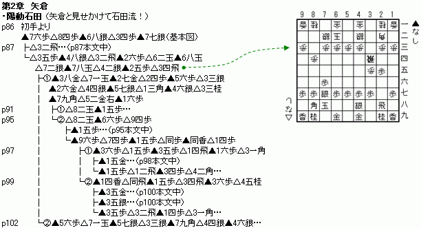 第2章は、矢倉編。矢倉の出だしである▲7六歩△8四歩▲6八銀△3四歩▲7七銀(or▲6六歩)から、あとで後手が振飛車にする。この展開が、狭義の陽動振飛車である。矢倉に必要な▲6八銀や▲7八金は、対振飛車には不急の一手というのが後手の主張となる。